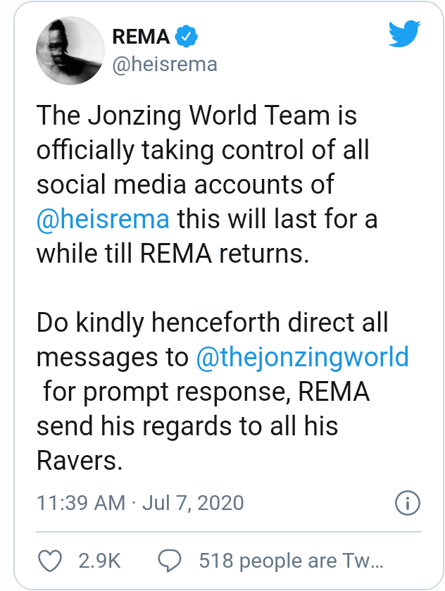 "The Jonzing World Team is officially taking control of all social media accounts of @heisrema this will last for a while till REMA returns. Do kindly henceforth direct all messages to @thejonzingworld for the prompt response, REMA sends his regards to all his Ravers"